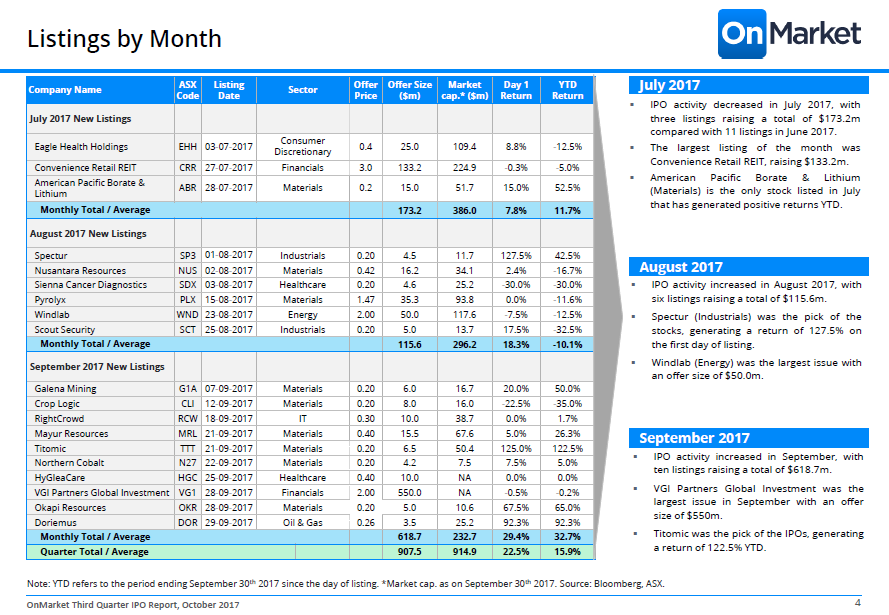 Companies that have undertaken an Initial Public Offering (IPO) this year have returned an average 25.9% for the nine months to September 30, an impressive 25.6% outperformance of the benchmark S&P/ASX 200 index which has returned 0.3% over the same period, according to the OnMarket 2017 Third Quarter IPO Report.