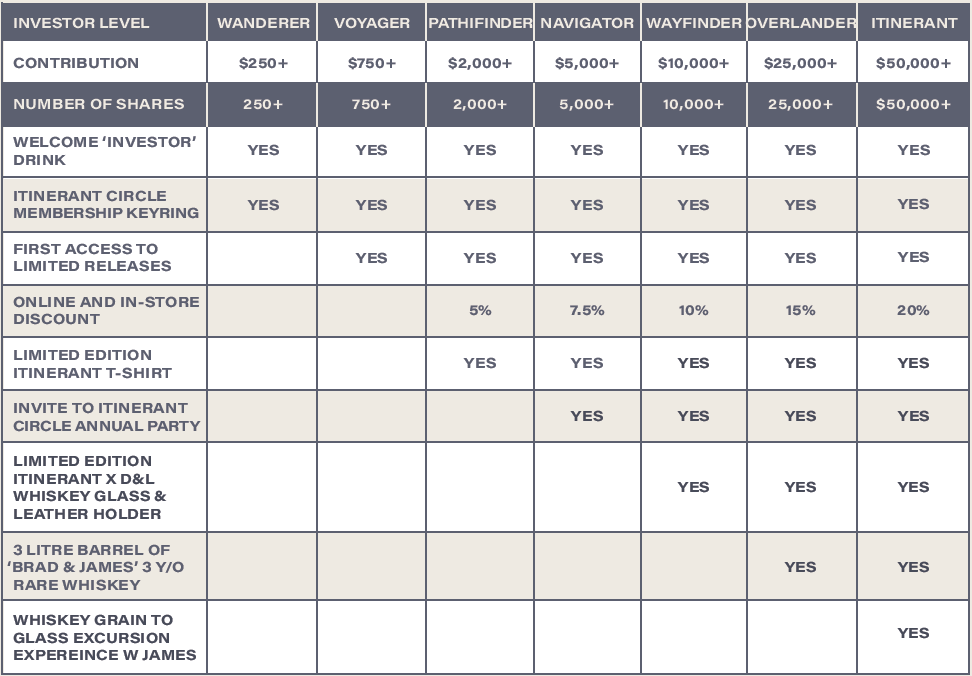 By investing in Itinerant Spirits, you can access exclusive rewards based on your investment size.