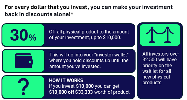 *Investor Terms and Conditions: Investor rewards are capped at AUD $10,000 in total discounts. Investments of AUD $10,000 or more receive discounts equal to AUD $10,000 (e.g., $10,000 off $33,333 RRP). Rewards must be redeemed within three (3) years through the Smart Lifestyle E-commerce platform, applicable only to full RRP products once the platform goes live on 1 November 2025. Rewards are non-transferable and cannot be redeemed through resellers.