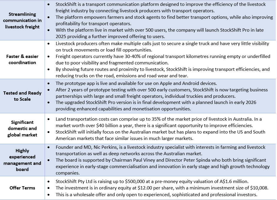 StockShift Pty Ltd (ACN 676 633 088) is a transport communication platform designed to improve the efficiency of livestock freight industry by connecting livestock producers with transport operators. As a result, they are empowering farmers and stock agents to find better transport options while also improving transport efficiencies, and ultimately reducing trucks on the road, emissions and road wear and tear.